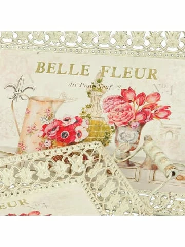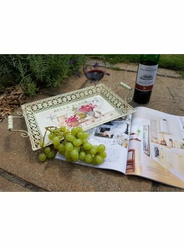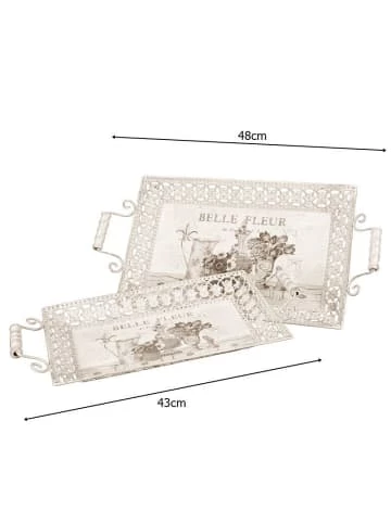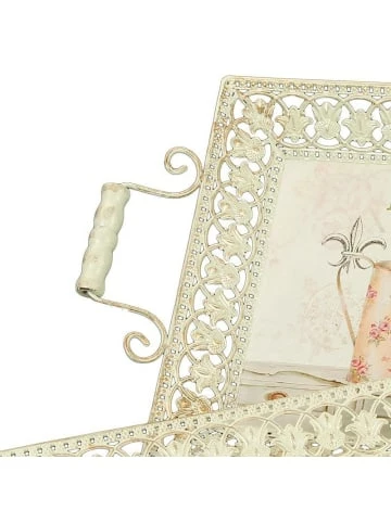 Dieses Set besteht aus zwei sorgfältig gefertigten Tabletts aus Metall und schafft ein romantisches Ambiente in Ihrem Zuhause. Die Tabletts haben jeweils zwei gedrehte Holzgriffe. Dank der jeweils vier Metallfüße wird Ihre Tischplatte vor heißen Tassen geschützt – perfekt also für die nachmittägliche Tea Time.Die stilvollen Tabletts wurden in einer antikwirkenden Cremefarbe mit einem leichten Goldpinseleffekt und Motiven von Belle Fleur Blumen gestaltet. Verwendbar auch im Bad für z. B. Seife und Badeöle oder in der Küche für Gewürze.Maße:L 8x48x26cm 0,48 KgS 7x43x21cm 0,38 Kg